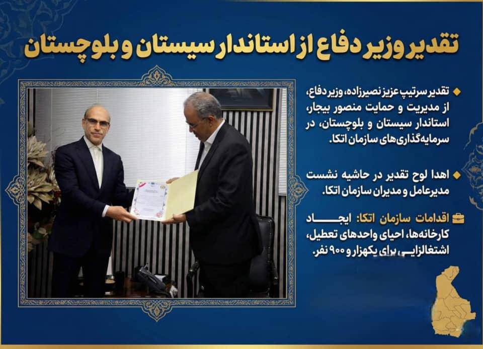 تقدیر وزیر دفاع و پشتیبانی نیروهای مسلح از استاندار سیستان و بلوچستان سرتیپ عزیز نصیرزاده وزیر دفاع و پشتیبانی نیروهای مسلح با اهدای لوح تقدیر از اقدامات و مدیریت منصور بیجار استاندار سیستان و بلوچستان در حمایت از سرمایه‌گذاری‌های سازمان اتکا در استان قدردانی کرد. در حاشیه نشست مدیرعامل و